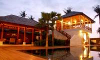Villa Avalon I comprises of three interconnected pavilions fanning out around the swimming pool. From a traditional gateway, steps lead up to the open-sided living room, which also gives access to the upper bedroom suites of the master pavilion and the guest pavilion. Steps lead down to the garden level and the dining hall, guest cloakroom and media room. Behind, across a small courtyard garden, is the kitchen and staff service area. To either side is access to the master and guest suites. Beyond the dining hall, a sail provides shade for the pool deck while at the other end of the pool is the garden joglo.