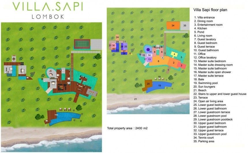 Villa Sapi in Lombok is a 5 bedroom, 3 pools masterpiece of design. Villa Sapi is bordered by Sira Beach against a backdrop of soothing seas, soaring peaks and sensational sunsets. Villa Sapi has a tennis court an additional childrem's pool and a stand-alone 2-bedroom guesthouse. Sapi with its funky architecture, set on a 2500m2 land, offers an exemplary service and gourmet cuisine. Villa Sapi’s massive beachfront garden, makes it also an ideal Lombok wedding or event venue, which can host up to 40 guests. Villa Sapi is secluded but not isolated, its neighbours include the Kosaido Golf Country Club and The Oberoi.