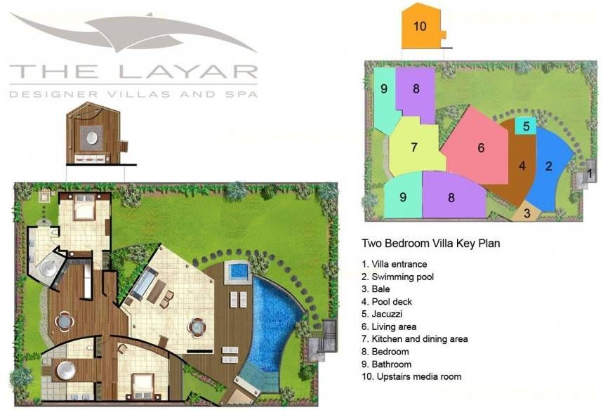 Each of the 7 spacious 2-bedroom Villa The Layar is spread across multiple levels under angled, overlapping roofs. The Layar 2 bedroom villas has an open living and dining space which sweeps from the edge of the pool across to the large, partly recessed kitchen and, via open-tread stairs, up to the mezzanine media room. Oriented for quiet seclusion, the master and guest bedroom suites are on separate sides of this vast living area, their ensuite bathrooms facing small private gardens.