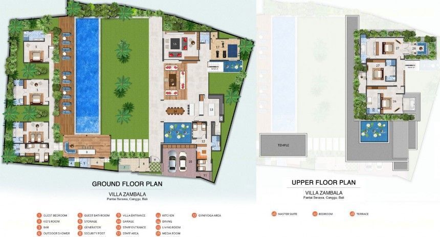 Viewed from the pool deck across the pool and adjoining lawn, the two-storey Main House encompasses open air dining with breakfast bar and a table seating 12; breezy fan-cooled lounge; air-conditioned library/media room and well-equipped, air-conditioned Gym/Yoga Room on the ground floor. Upstairs the spacious Master Suite vaunts an outdoor bath-tub for romantic starlight bathing, while each of the two Upper Guest Suites enjoys a private alfresco terrace.