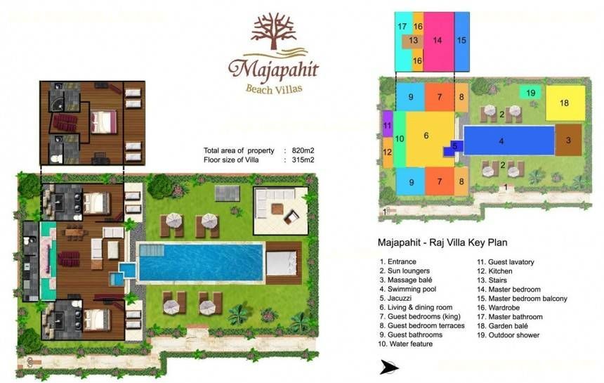 Комплекс вилл Majapahit Beach состоит из 4 вилл класса бутик на 3 спальни каждая. Виллы расположены подле сверкающих черных песков юго-восточного побережья Бали. Две виллы комплекса находятся на берегу, и их территория включает плавательный бассейн и пышные тропические сады, которые протянулись до частного 14-метрового участка побережья, окаймленного деревянной террасой. В комплекс входит еще две виллы с видом на океан и идентичной планировкой и уровнем обслуживания.